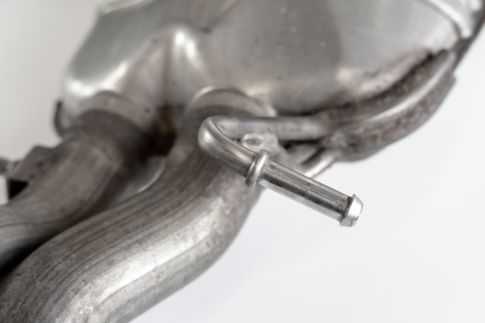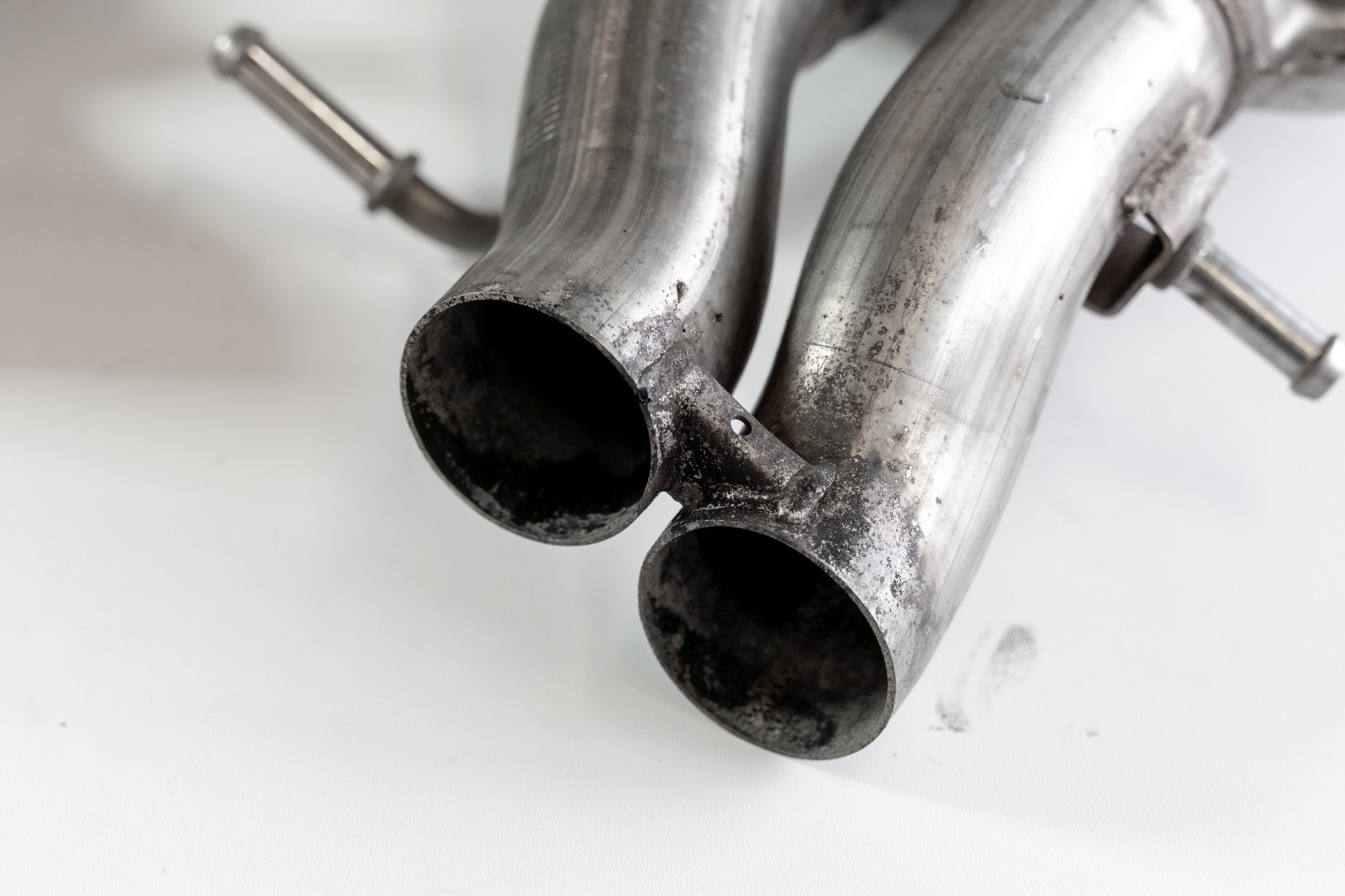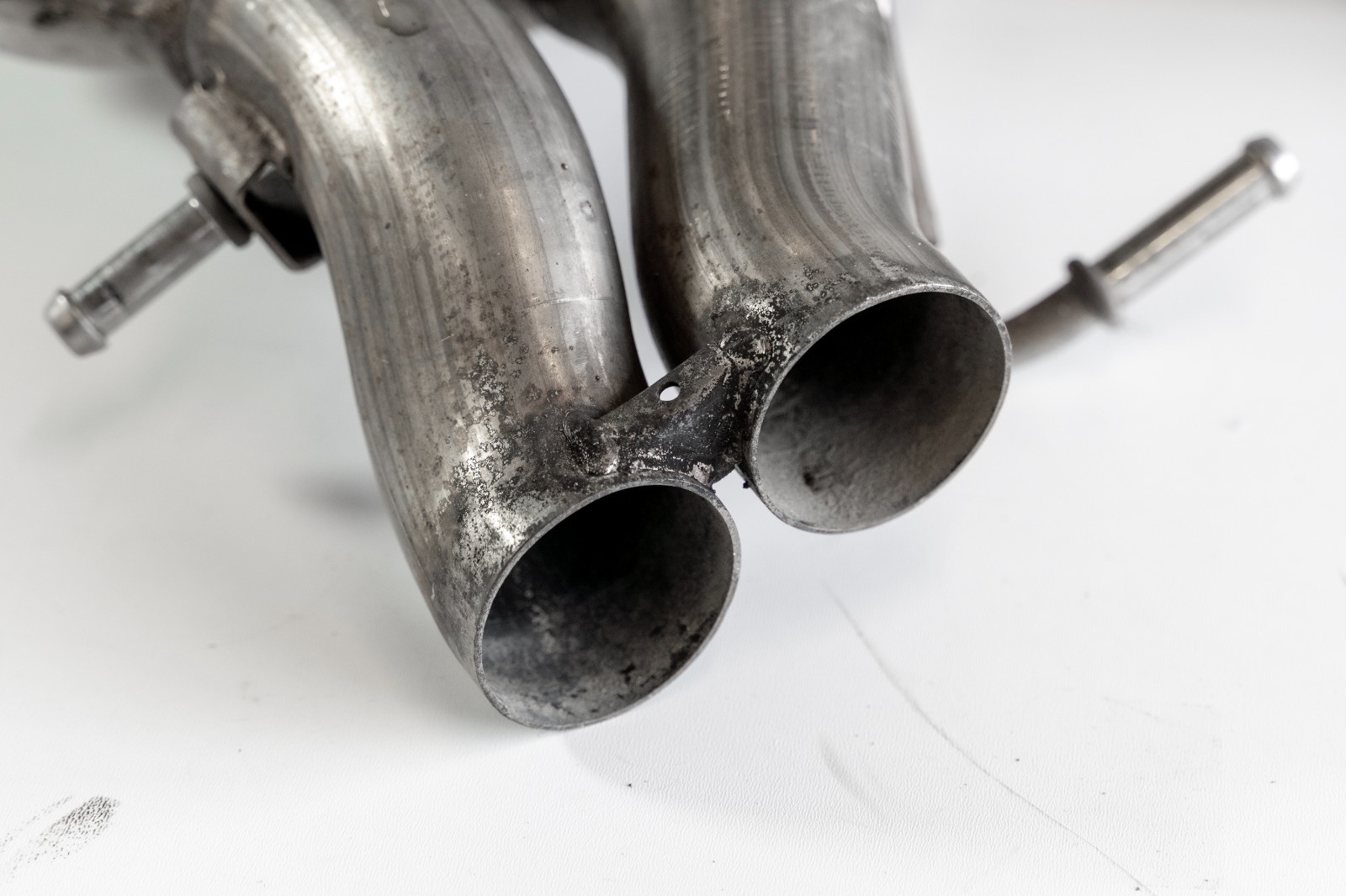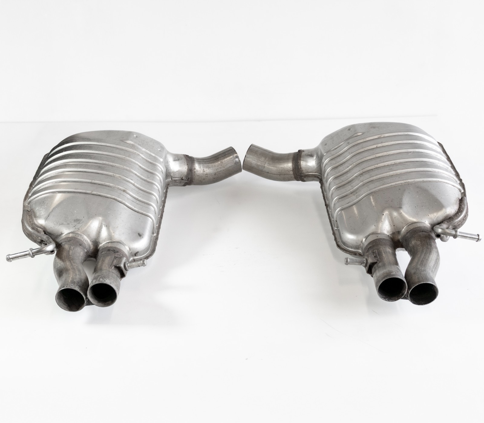 Pre-owned mufflers. Removed off a 2015 Mercedes Benz E63 AMG S with 98 000 km (approx. 60.5k miles). Muffler pipes was cut to reduce shipping dimensions and cost. Will require clamps or welding to install.