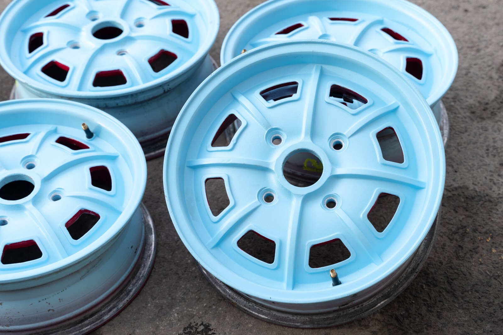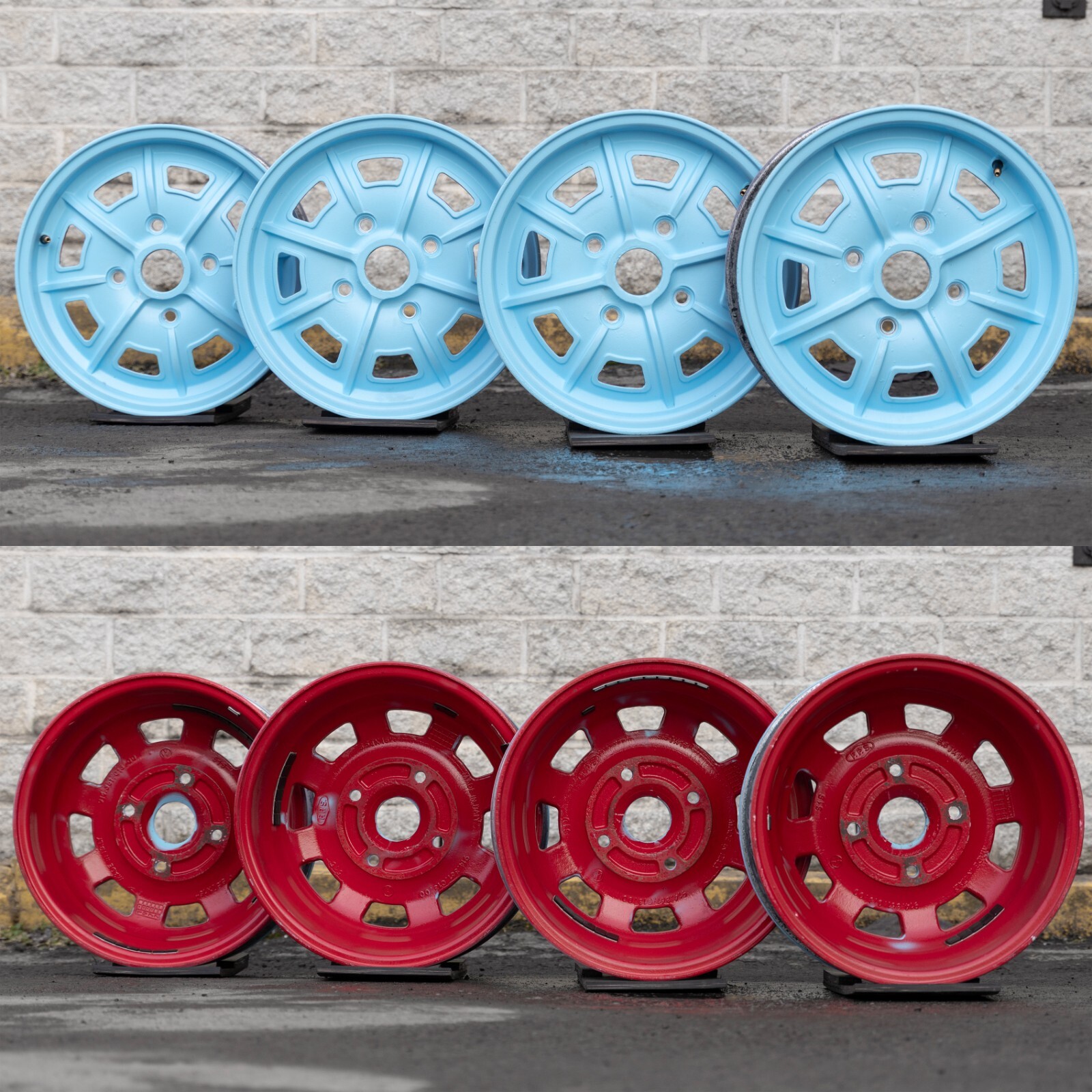 Pre-owned wheel set. Rims were painted blue in the face and red in the back by previous owner. They have some alloy imperfections underneath the paint as shown in the photos. Not bent and never cracked. Ready for next business day dispatch! Please see last image for estimated shipping delivery time.